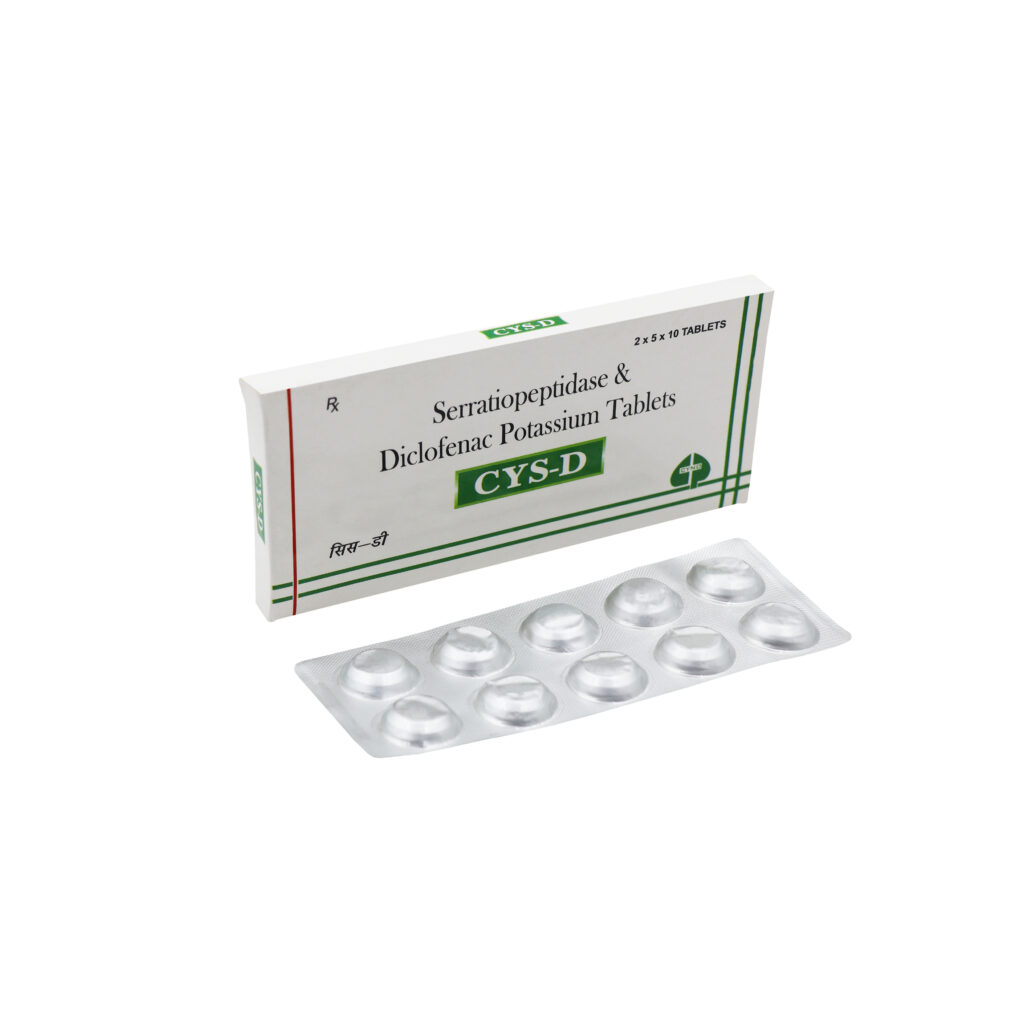 Diclofenac Potassium, safe and potent NSAID’S for pain relief in cardiac and diabetic patients. When combined with serratiopeptidase, a proteolytic enzyme, there is faster resolution of pain, inflammation and tenderness.